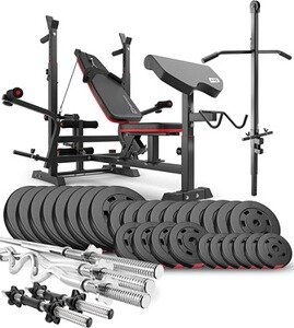 - Ce banc de musculation multifonction avec barres d'haltères et disques est conçu pour un usage domestique intensif. Charge maximale du banc: 270 kg.