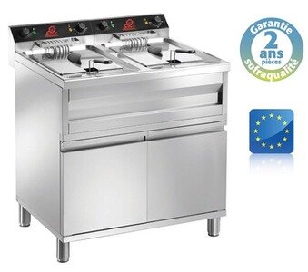 Friteuse électrique sur coffre – Super puissante – 2 x 12 Litres – SofracaLa Friteuse sur coffre électrique super puissante est un appareil de cuisson professionnel simple et rapide spécialement étudié pour réaliser des frites fraîches ou surgelées, beignets, poissons panés etc…Une fabrication spécialement étudiée pour les professionnels de la restauration avec deux cuves embouties, une grille de protection dans chaque cuve, deux robinets de vidange et bac tout inox avec système de sécurité, 2 thermostat pour régler la température séparément selon les besoins et deux boutons On/Off avec voyants lumineux. Mais aussi, positionnement facile du panier, zone de foisonnement emboutie et un accès facile aux résistances pour un nettoyage aisé et une hygiène parfaite !Cette friteuse professionnelle sur coffre est équipée d’une zone froide sous le corps de chauffe, ce qui permet de ne pas transmettre de goût entre les différents plats (vous pouvez donc frire successivement avec la même huile, des frites, du poissons, etc… et cela vous permet de réduire la consommation d’huile).Capacité : 2 x 12 Litres Thermostat : 2 Puissance : 2 x 9000 W Alimentation : 400/3/N/T Dimension Panier : (2x) 230 x 280 x 120 mm .