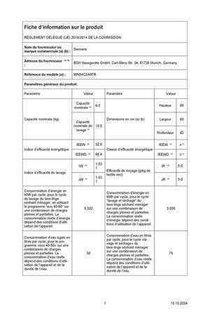 | Vitesse d’essorage (tours/min) |