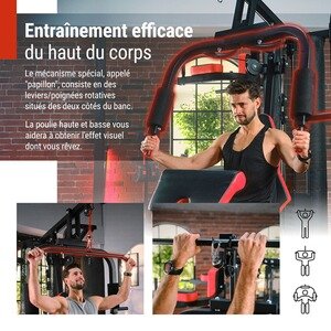 Un mécanisme spécial, appelé les papillons, sont des leviers/poignées rotatifs des deux côtés du banc. Ces poignées sont utilisées pour exercer des fentes, l’un des exercices les plus efficaces pour les muscles de la poitrine. Après avoir modifié les réglages, cette partie du multi-gym peut également être utilisée pour le développé couché.
