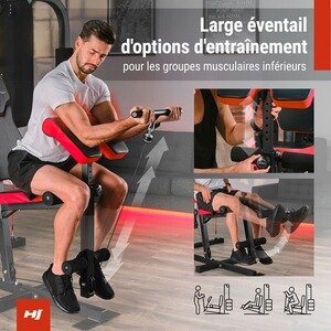 L’entraînement sur banc incliné se concentre principalement sur l’étirement et le renforcement des muscles abdominaux – droits et latéraux. Il est possible d’ajuster l’angle du banc et de le plier. Le multigym est livré avec deux haltères de 1,5 kg.