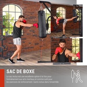 La station de musculation HS-1054K est livrée avec des gants et un sac de boxe de forme cylindrique. Les gants inclus sont de taille universelle et constitueront un excellent choix pour les débutants.