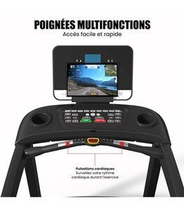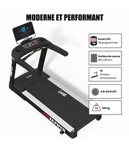 Structure hautement résistance. Moteur 5CVP puissant, silencieux. Vitesse de 0.8 à 24km/h.Inclinaison motorisée 15 niveaux. Capteurs de pulsation cardiaque. Compatible ceinture thoracique CARE connect.